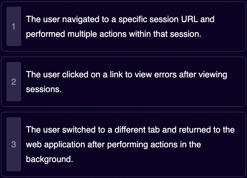 The Sessions Insights digest lists the top 3 most interesting sessions for the week. These sessions are chosen by looking at the user journey in each session, and calculating which journeys are the least likely. These sessions tend to show users who may be frustrated or are using the app in unexpected ways.