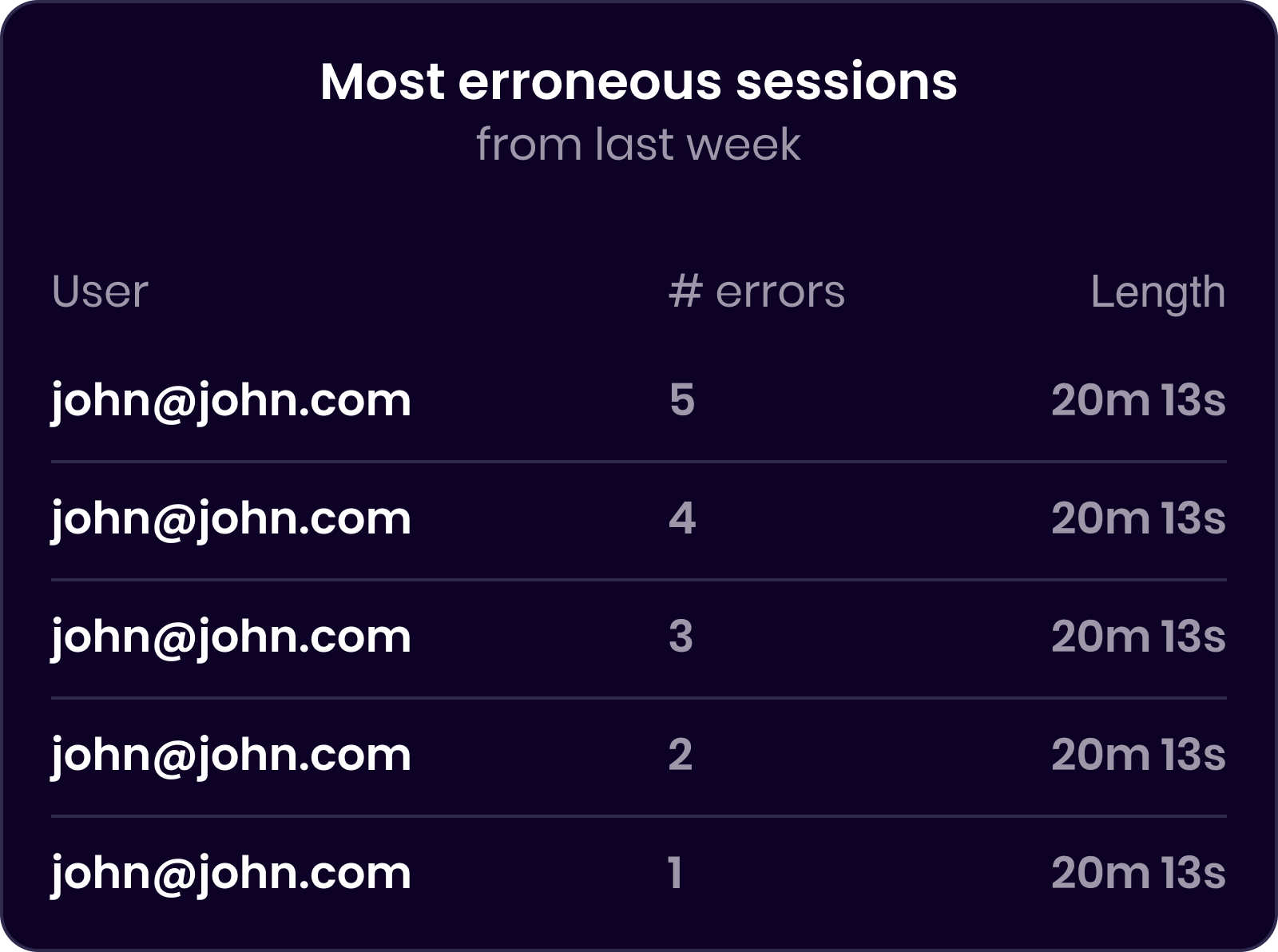 - Project Overview summarizes aggregate user activity and lists the top errors and sessions for the week