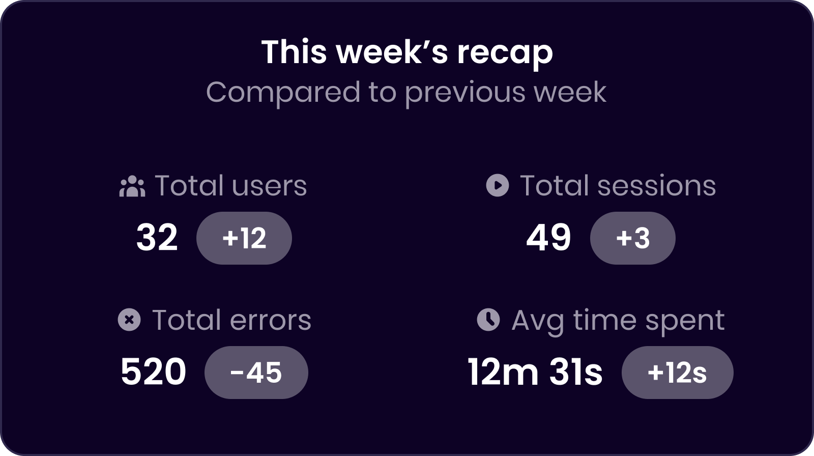 This section shows aggregate user activity stats for last week and the change from the prior week. This includes total users (the count of unique users), total sessions, total errors, and average time spent (average active time per session).