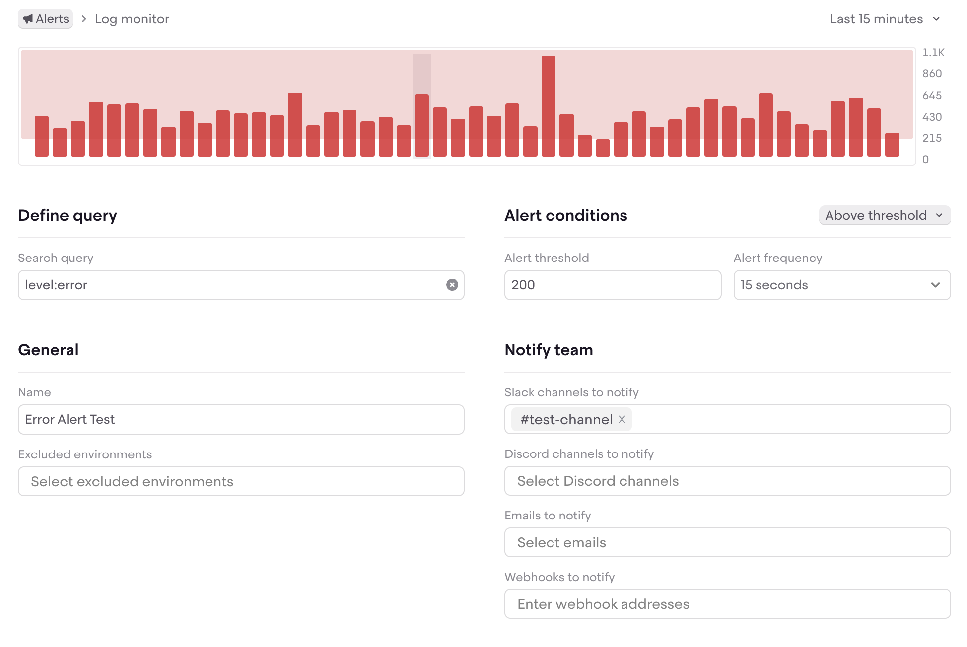 Log alerts can be configured to notify you via Slack, Discord, email, or webhooks. For more details, see alerts.