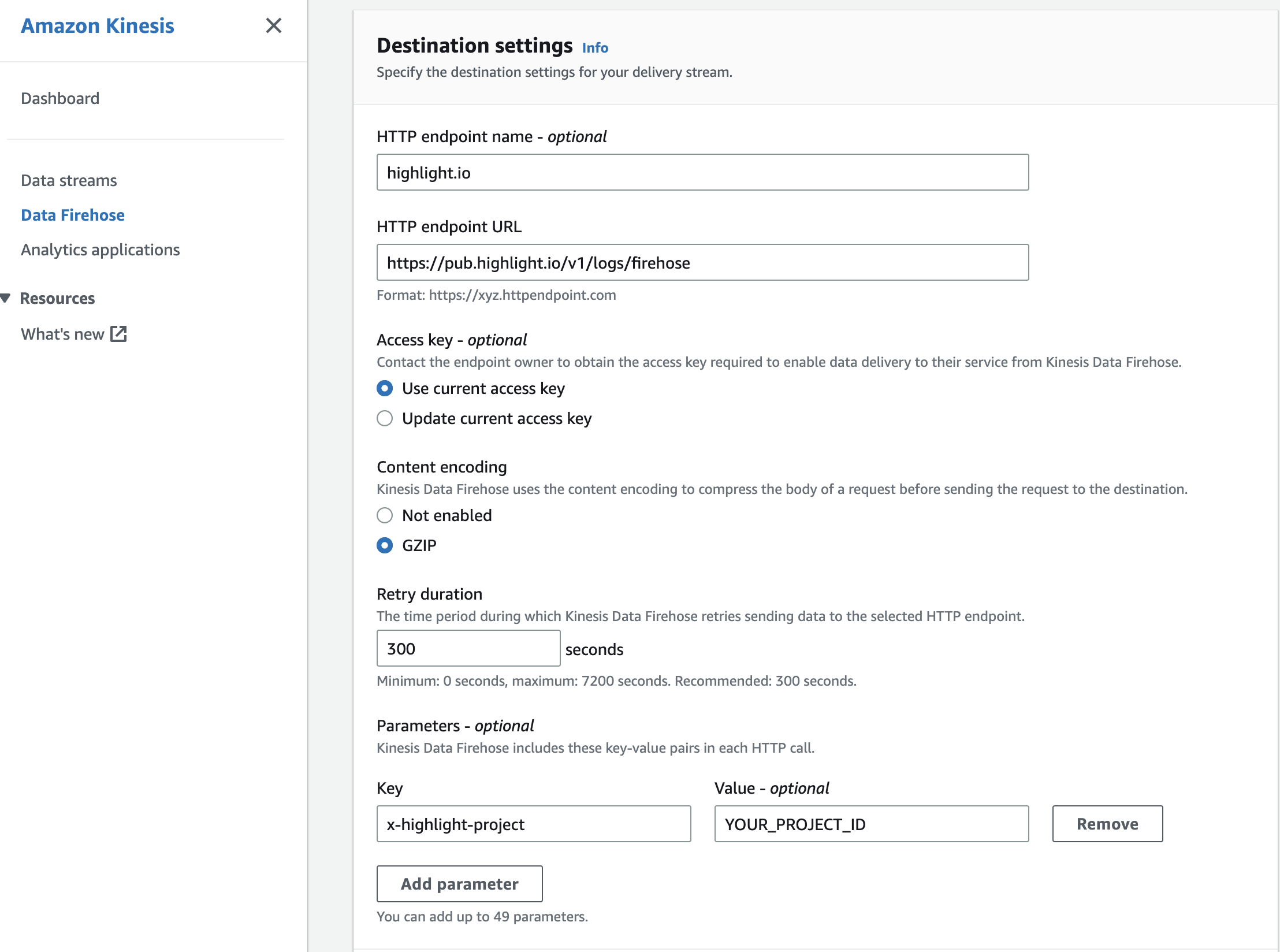 Next, create a Kinesis Data Firehose with an HTTP destination to route data to highlight.