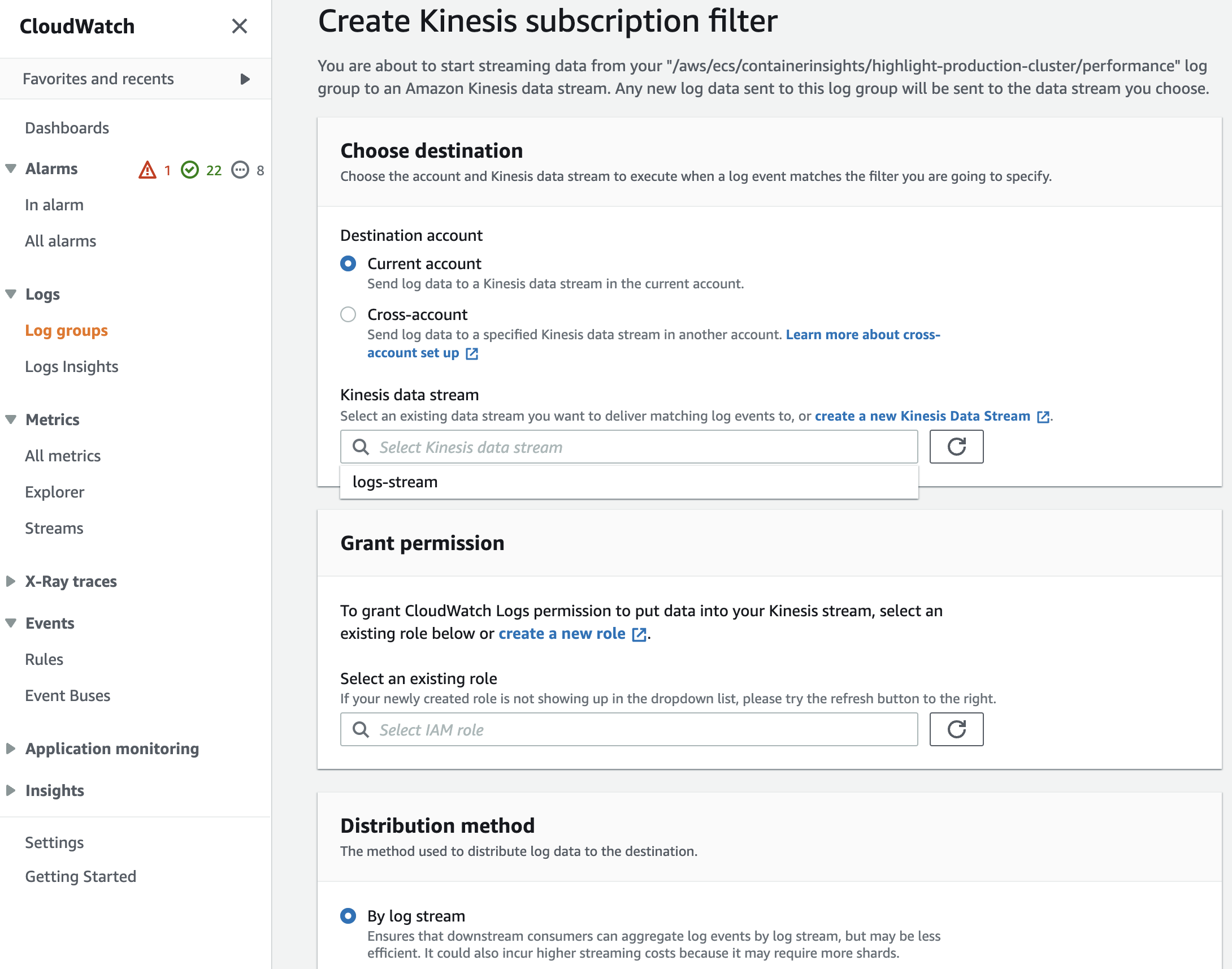 Finally, connect your AWS CloudWatch Log Stream to the Kinesis Data Stream via a Kinesis Subscription Filter.